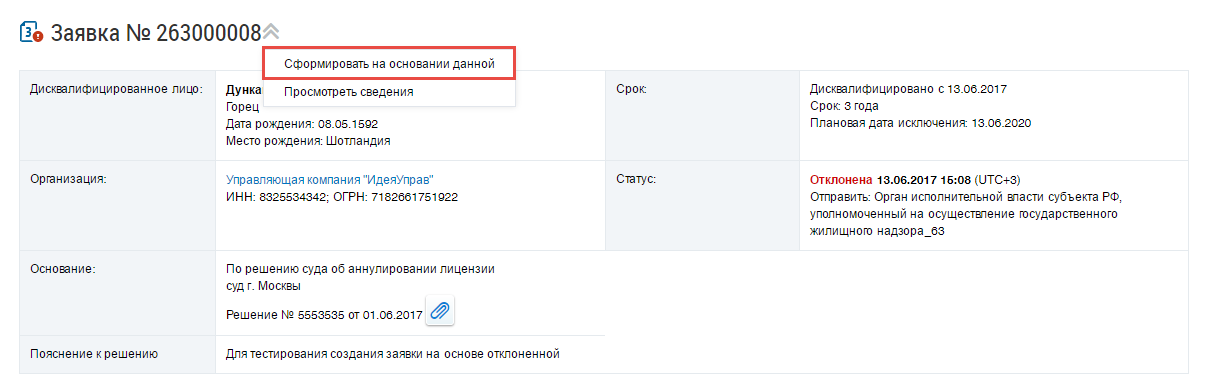 Формирование заявки на включение сведений о дисквалифицированных лицах