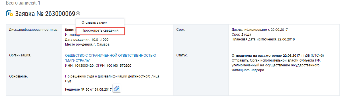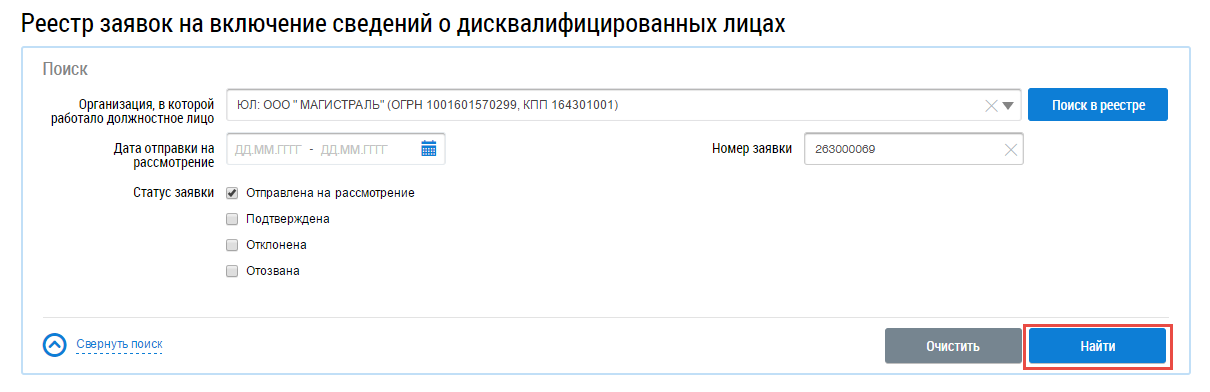 Поиск и просмотр заявок на включение сведений о дисквалифицированных лицах