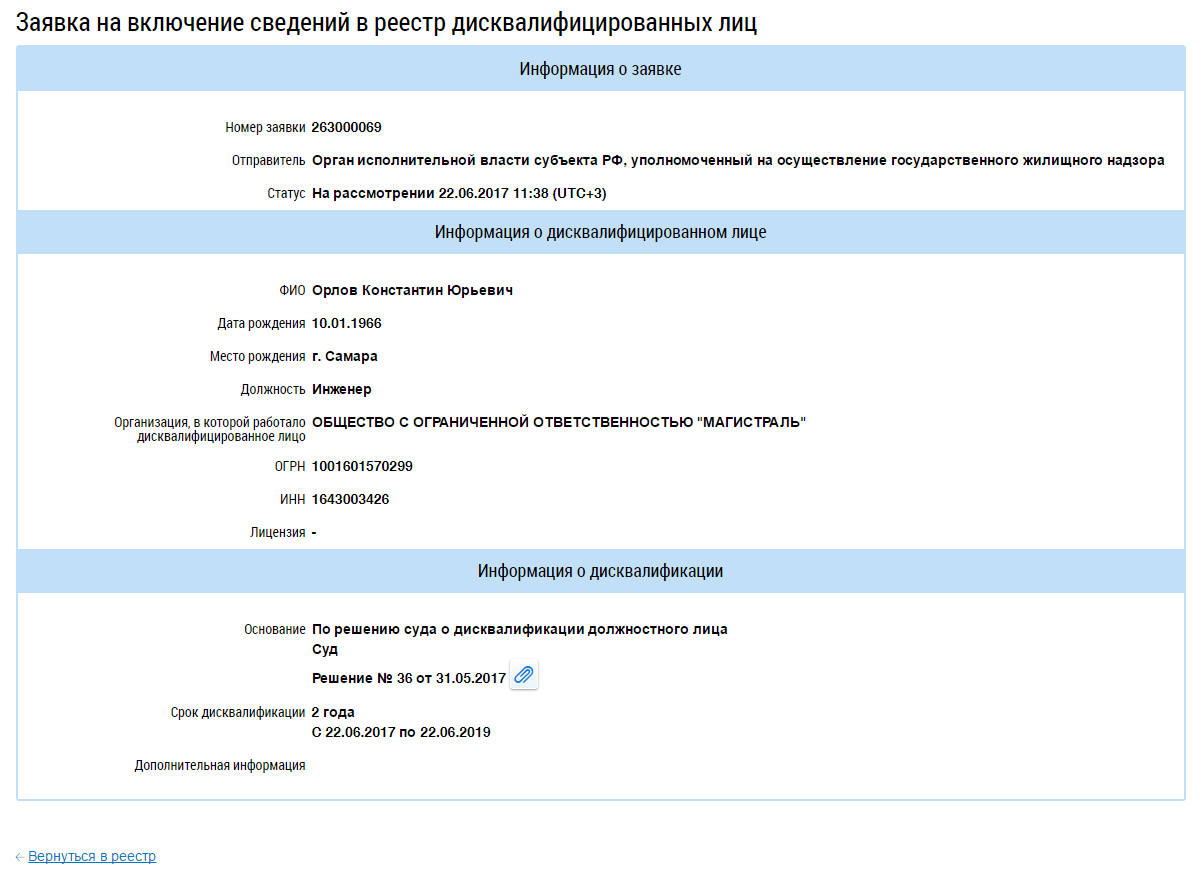 Отображается карточка заявки на включение сведений в реестр дисквалифицированных лиц.