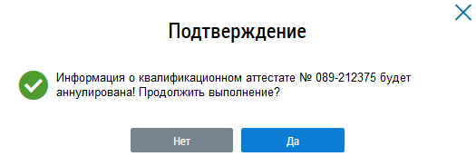 Отображается окно подтверждения аннулирования информации о квалификационном аттестате.