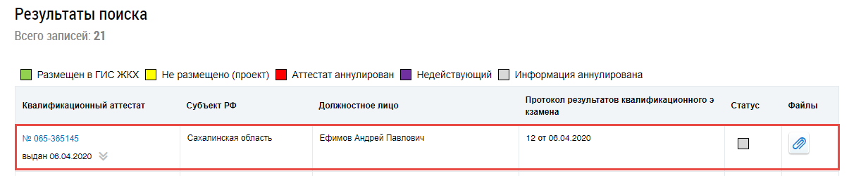 Информация о квалификационном аттестате переходит в статус Информация аннулирована и отображается с пиктограммой