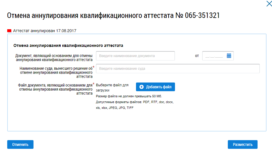 Для заполнения полей Документ, являющийся основанием для отмены аннулирования квалификационного аттестата и Наименование суда, вынесшего решение об отмене аннулирования квалификационного аттестата введите необходимые значения. Прикрепите файл документа, являющийся основанием для отмены аннулирования квалификационного аттестата, нажав на кнопку Добавить файл. Проверьте корректность введенных данных и нажмите на кнопку Разместить. Для отмены – Отменить.