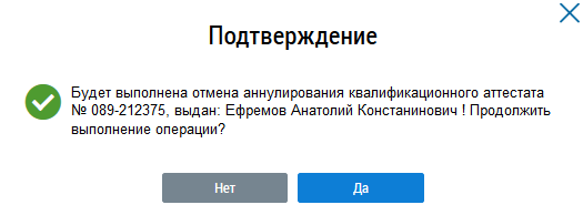 Отображается окно подтверждения отмены аннулирования квалификационного аттестата.