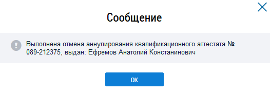 При подтверждении отображается сообщение о выполнении отмены аннулирования квалификационного аттестата.