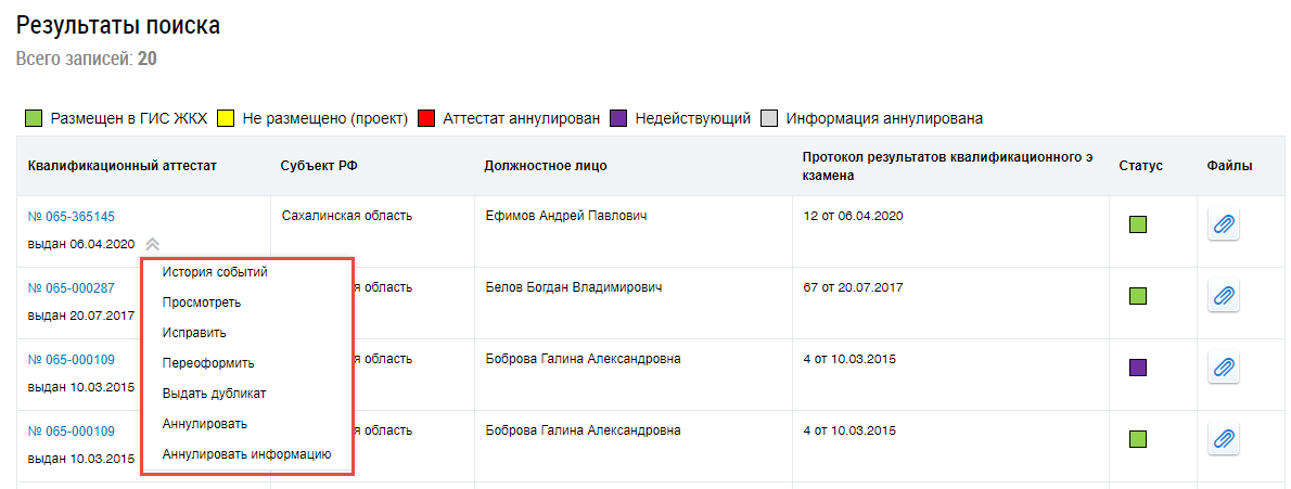 Первоначальная версия квалификационного аттестата после внесения правок переходит в статус Недействующий и для нее становятся доступны только действия Просмотреть и История событий.