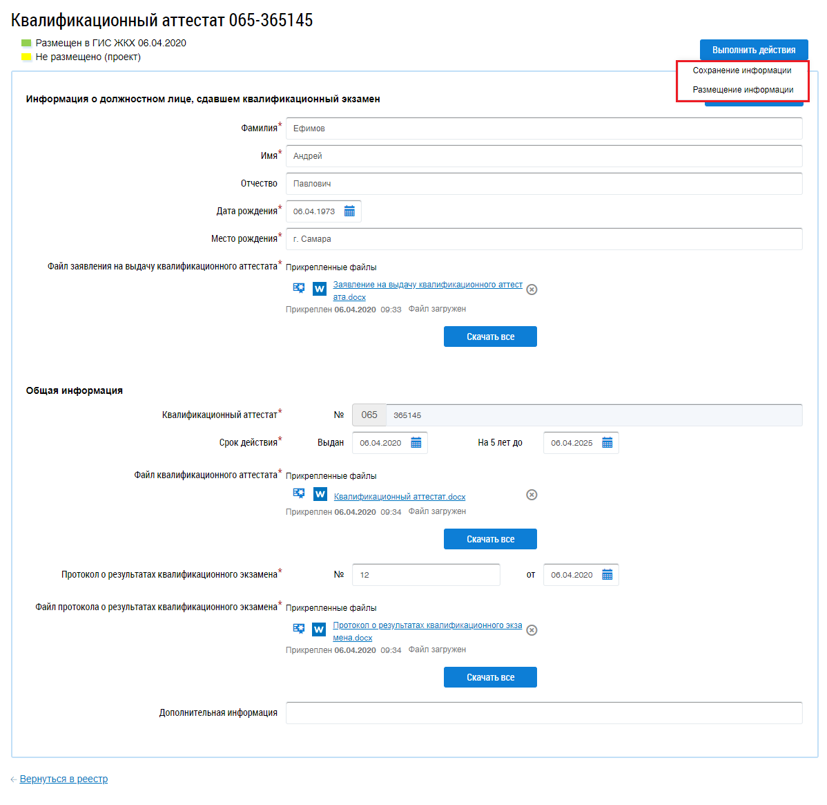 Внесите необходимые изменения и сохраните информацию, нажав на кнопку Выполнить действия, а затем Сохранение информации или Размещение информации. При сохранении информации в системе создается новый проект квалификационного аттестата.