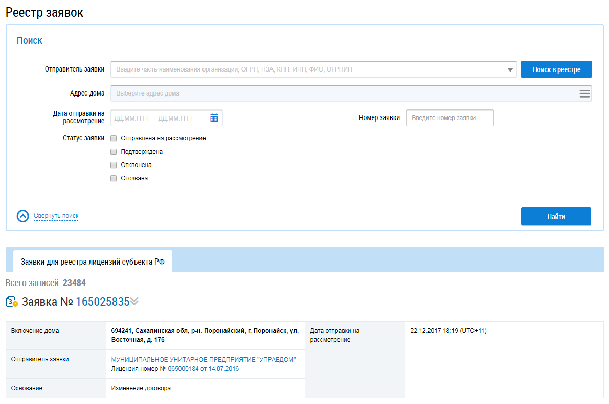 Реестр заявок на размещение информации о домах