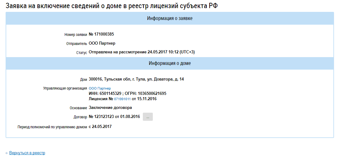 Отображается страница Заявка на включение сведений о доме в реестр лицензий субъекта РФ.