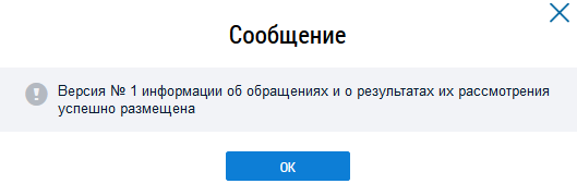 Для подтверждения размещения информации нажмите на кнопку Да, для отмены операции – Нет. При подтверждении отображается сообщение об успешном размещении информации об обращениях и результатах их рассмотрения.