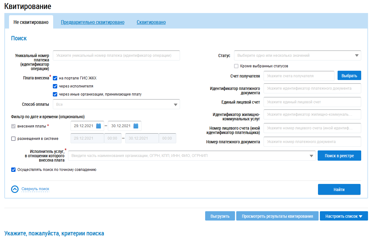 Данный раздел доступен после предоставления представителю организации права доступа «Контроль за размещением информации о квитировании». Для получения необходимых прав обратитесь к Администратору организации.