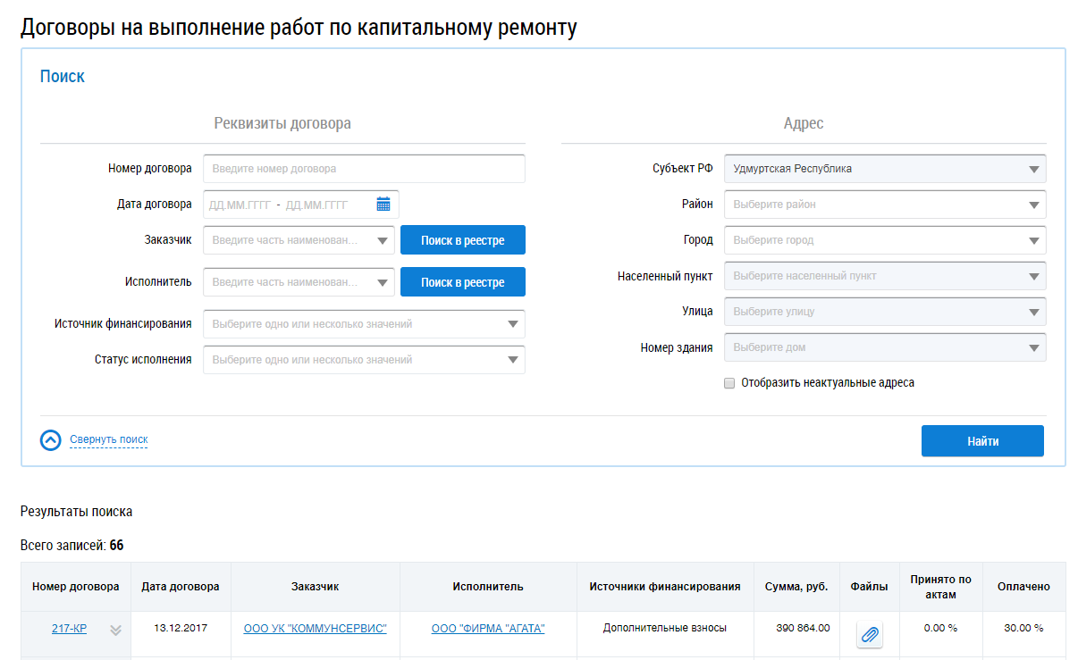 Для перехода к реестру договоров на выполнение работ по капитальному ремонту нажмите на соответствующую гиперссылку на странице Контроль за размещением информации.