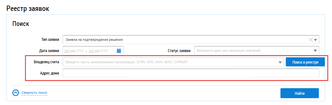 Для заполнения поля Владелец счета введите часть наименования организации в соответствующее поле или нажмите на кнопку Поиск в реестре.
