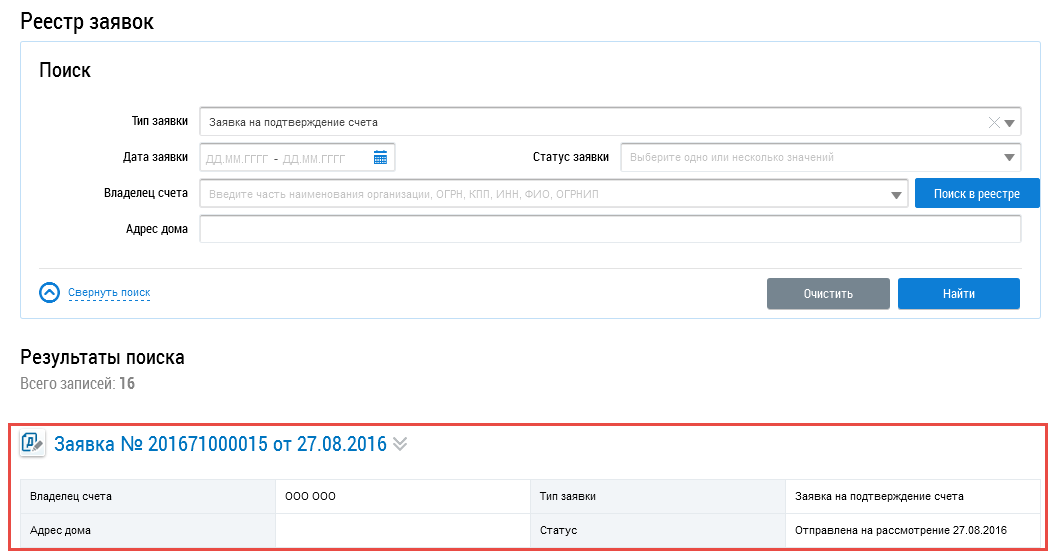 Заявки, удовлетворяющие введенным параметрам, отображаются в блоке Результаты поиска.