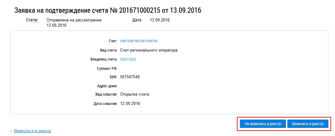 Для отклонения заявки на подтверждение счета нажмите на кнопку Не включать в реестр ( Карточка заявки на подтверждение счета, кнопки «Включить в реестр» и «Не включать в реестр» ).