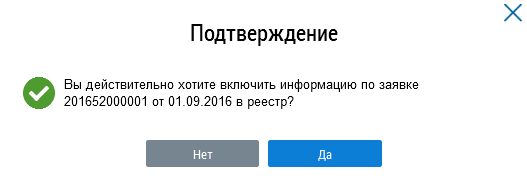Для подтверждения заявки нажмите на кнопку Включить в реестр. Отображается окно подтверждения заявки. Для подтверждения нажмите на кнопку Да, для отмены – Нет.