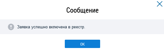 Отображается сообщение о подтверждении включении заявки в реестр.