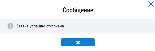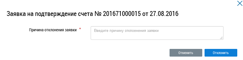 Введите причину отклонения заявки в соответствующее поле и нажмите на кнопку Отклонить. Для отмены операции нажмите на кнопку Отклонить.