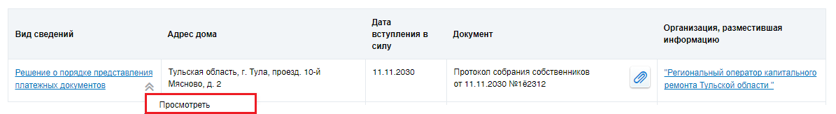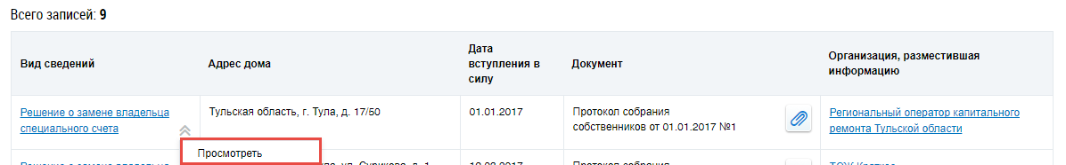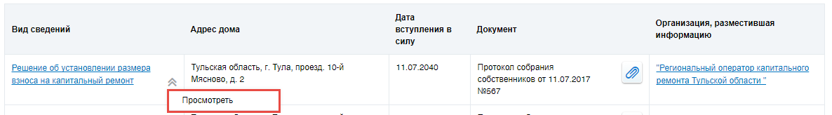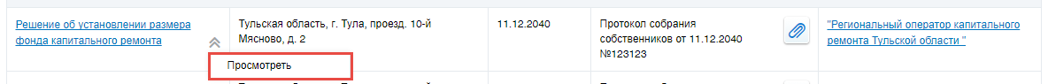 Для просмотра решения об установлении размера взноса на капитальный ремонт выберите пункт контекстного меню решения Просмотреть.