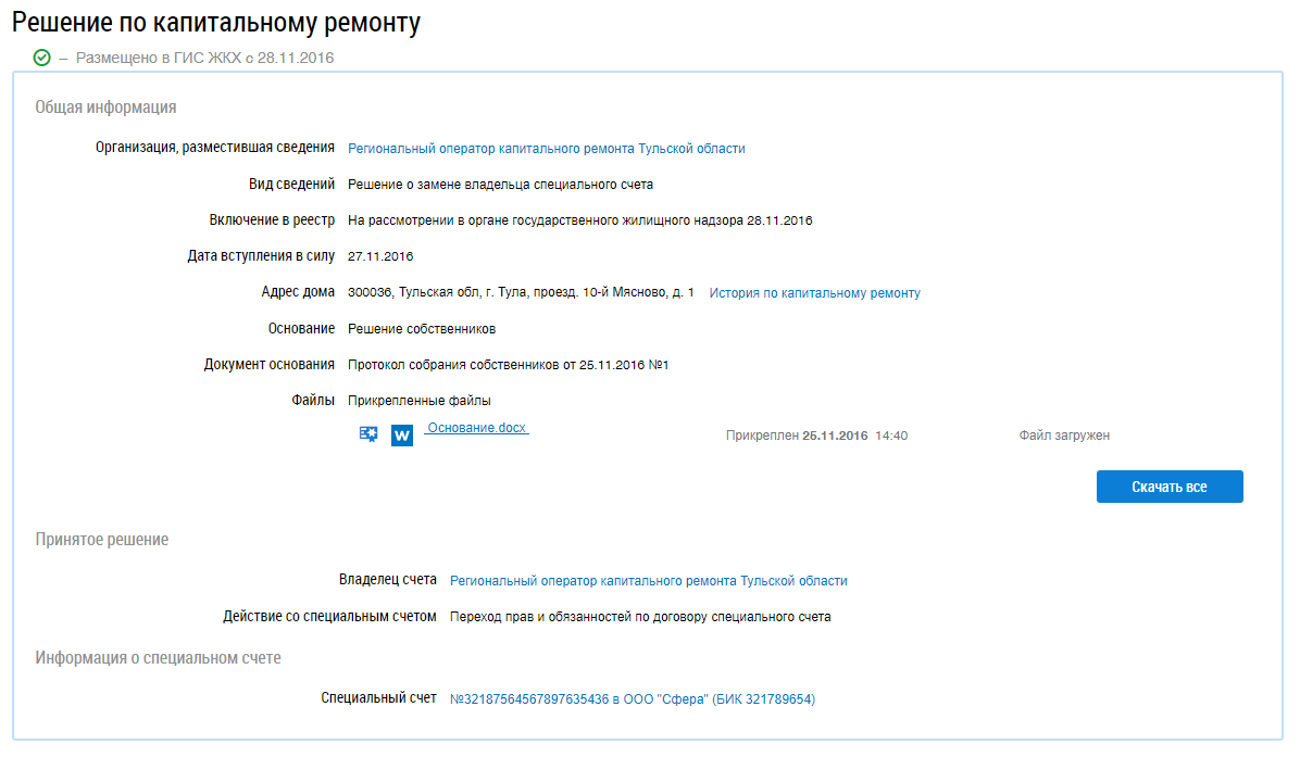 На странице отображается общая информация о решении, основание решения и информация о специальном счете. Для просмотра истории по капитальному ремонту нажмите на гиперссылку История по капитальному ремонту. Система выполняет сохранение файла с историей капитального ремонта многоквартирного дома на компьютер.