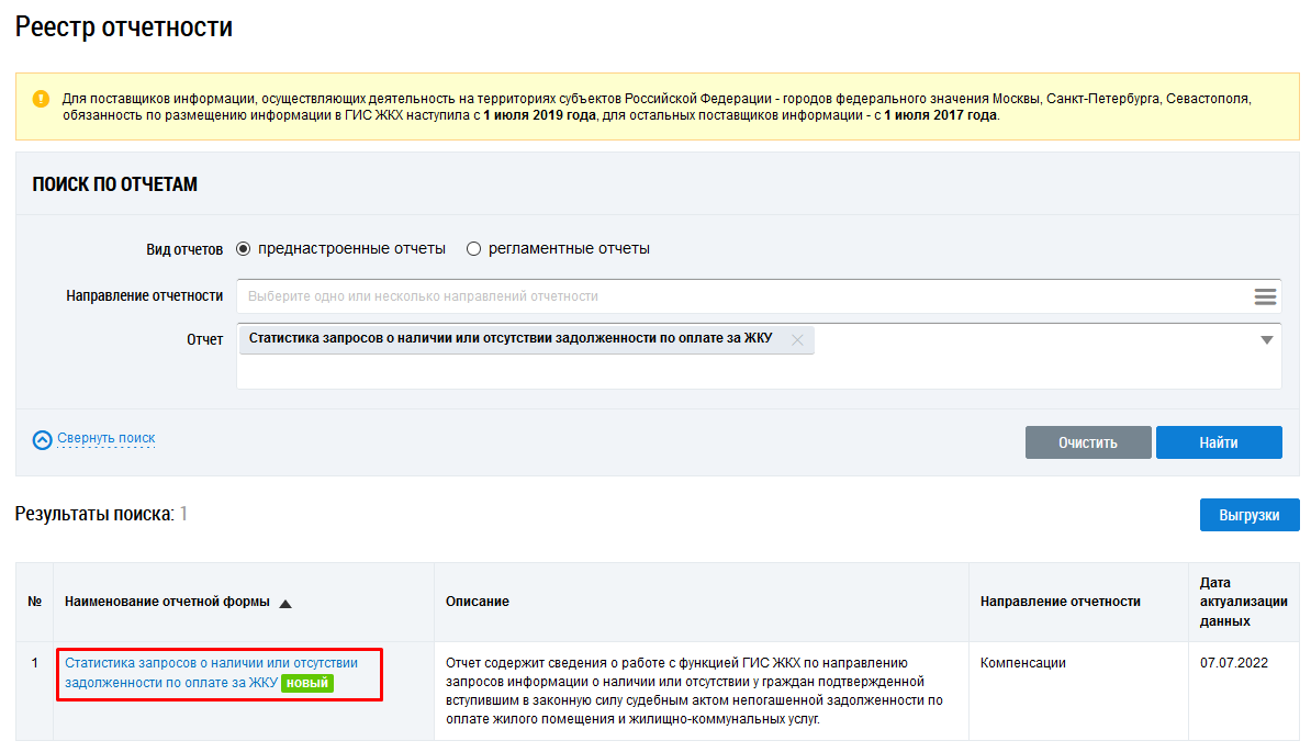 Для перехода на страницу Статистика по запросам о наличии или отсутствии задолженности по оплате за жилое помещение и ЖКУ установите переключатель Вид отчетов в положение Преднастроенные отчеты. Затем в поле Отчет выберите из выпадающего списка отчет Статистика по запросам о наличии или отсутствии задолженности по оплате за жилое помещение и ЖКУ. Нажмите на кнопку Найти, а затем на гиперссылку с наименованием отчета.