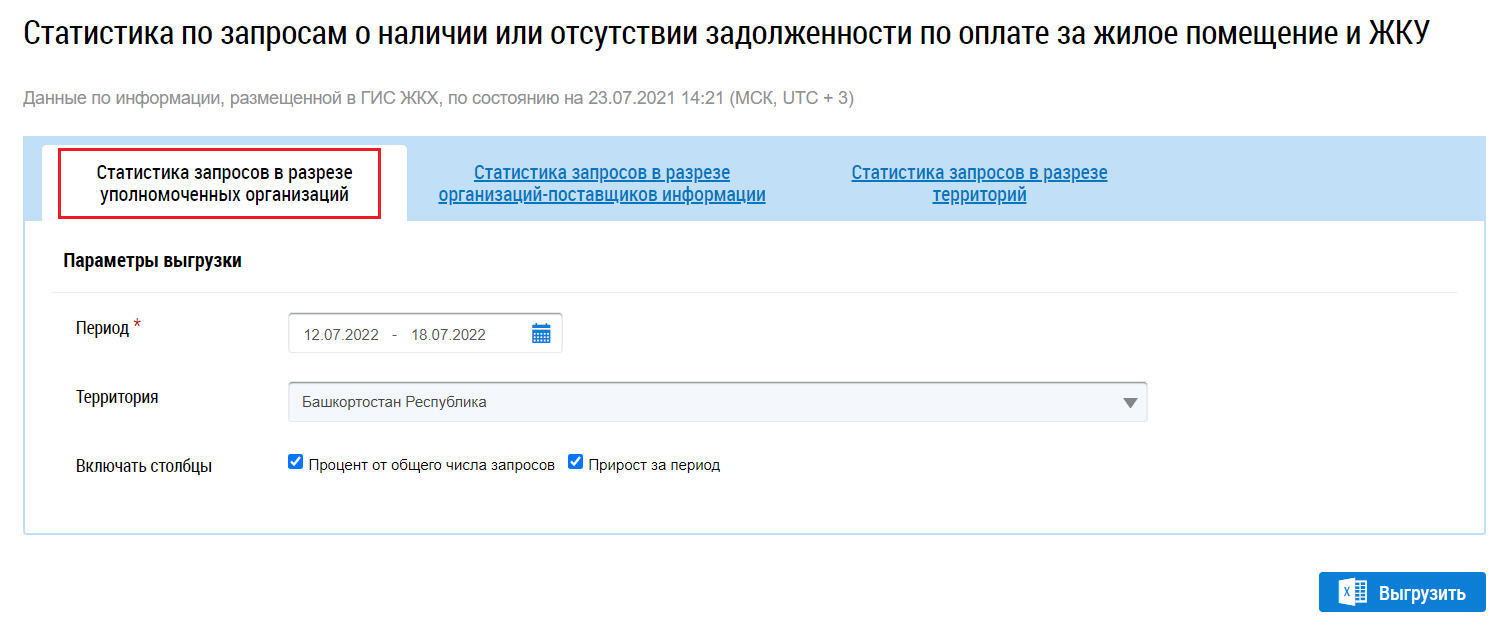 Последующие действия аналогичны тем, что описаны выше для формирования отчета в разрезе уполномоченных организаций (Страница «Статистика по запросам о наличии или отсутствии задолженности по оплате за жилое помещение и ЖКУ», вкладка «Статистика запросов в разрезе уполномоченных организаций»).