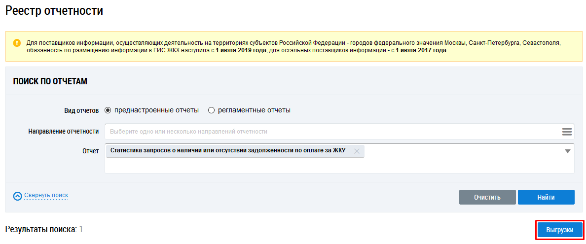 В сообщении нажмите на гиперссылку Реестре отчетности. Отображается страница Реестр отчетности. Нажмите на кнопку Выгрузки.