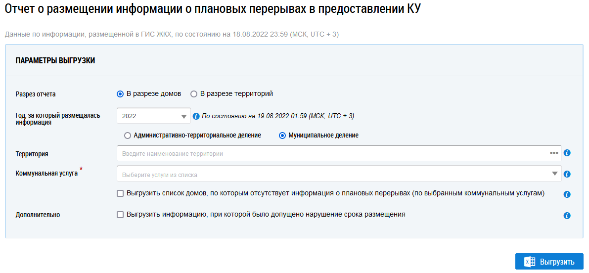 Отчет формируется на основе информации, размещенной в реестре перерывов в предоставлении коммунальных услуг.