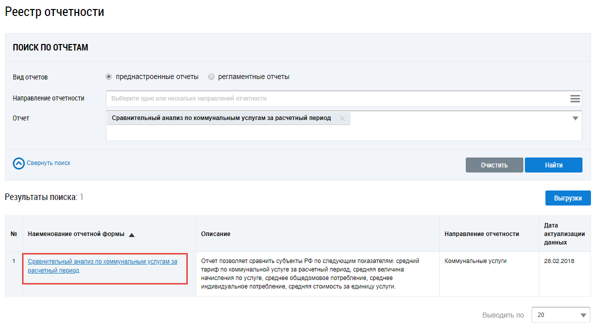 Для сохранения сформированного отчета нажмите на кнопку Выгрузки на странице Реестр отчетности и выберите в выпадающем списке необходимый отчет.