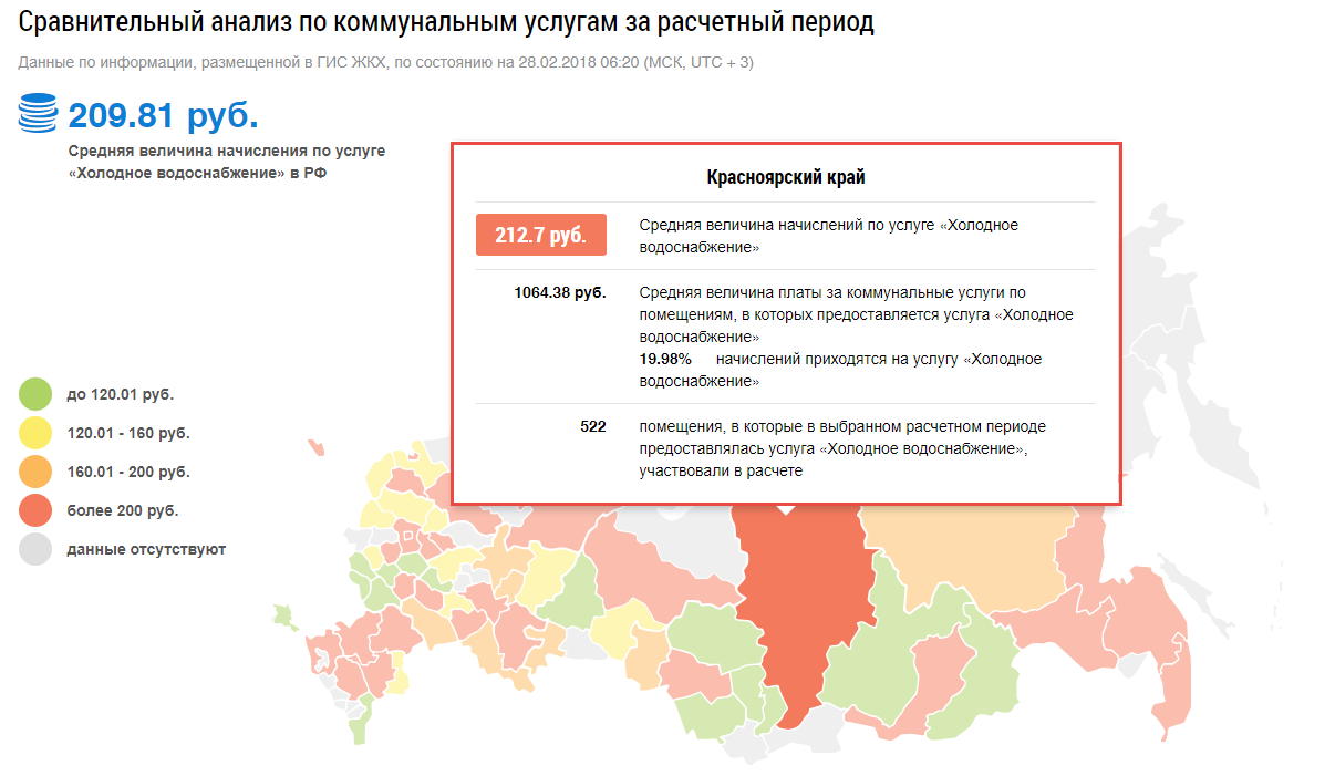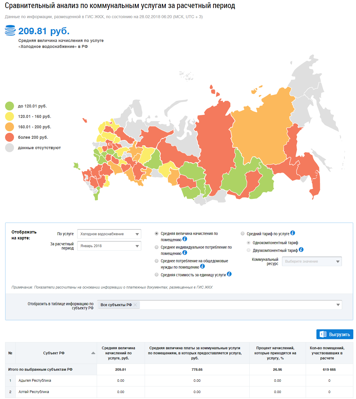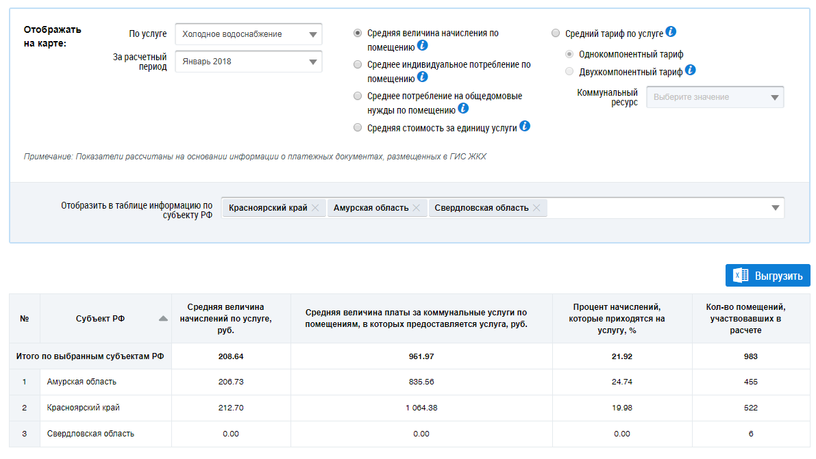 Для фильтра отображения на карте выберите значения из выпадающего списка в полях По услуге и За расчетный период. Установите переключатель в одном из полей: Средняя величина начисления по помещению, Среднее индивидуальное потребление по помещению, Среднее потребление на общедомовые нужды по помещению, Средняя стоимость за единицу услуги. При установке переключателя Средний тариф по услуге необходимо выбрать одно из значений: Однокомпонентный тариф или Двухкомпонентный тариф (применяется при выбранной услуге Горячее водоснабжение). В зависимости от фильтра при наведении на карте на определённый субъект отображается информация по средним показателям по коммунальным услугам по субъекту.