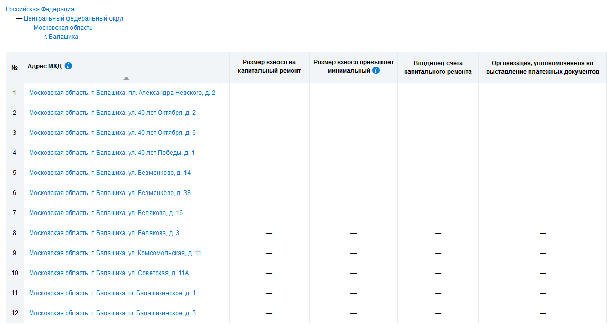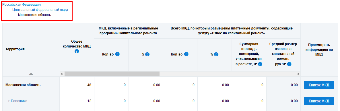 Для просмотра списка домов, относящихся к выбранной территории, нажмите на кнопку Список МКД. Отображается таблица с подробной информацией об МКД, у которых в Системе размещена информация размере взносов на капитальный ремонт на выбранной территории.