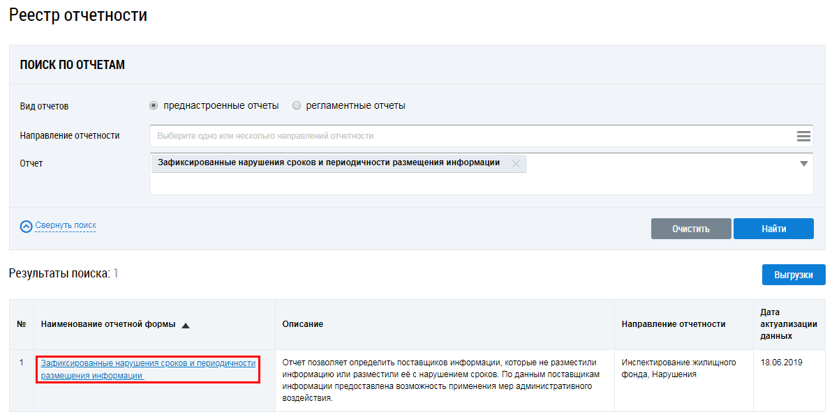 Для перехода к отчету Зафиксированные нарушения сроков и периодичности размещения информации установите переключатель в положение Преднастроенные отчеты (см. Раздел меню «Аналитика и отчеты»). Затем нажмите на гиперссылку с наименованием отчета Зафиксированные нарушения сроков и периодичности размещения информации.