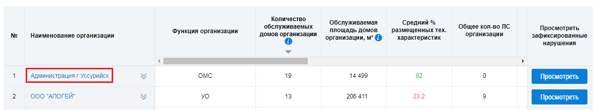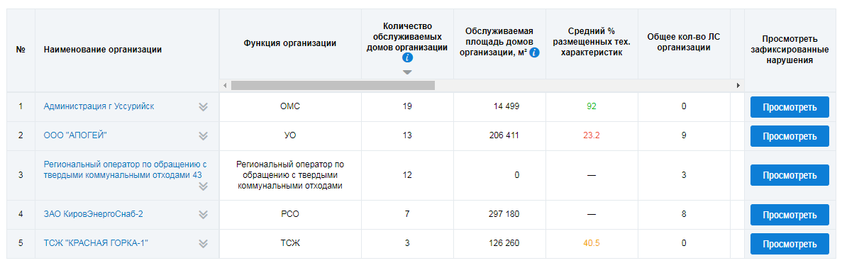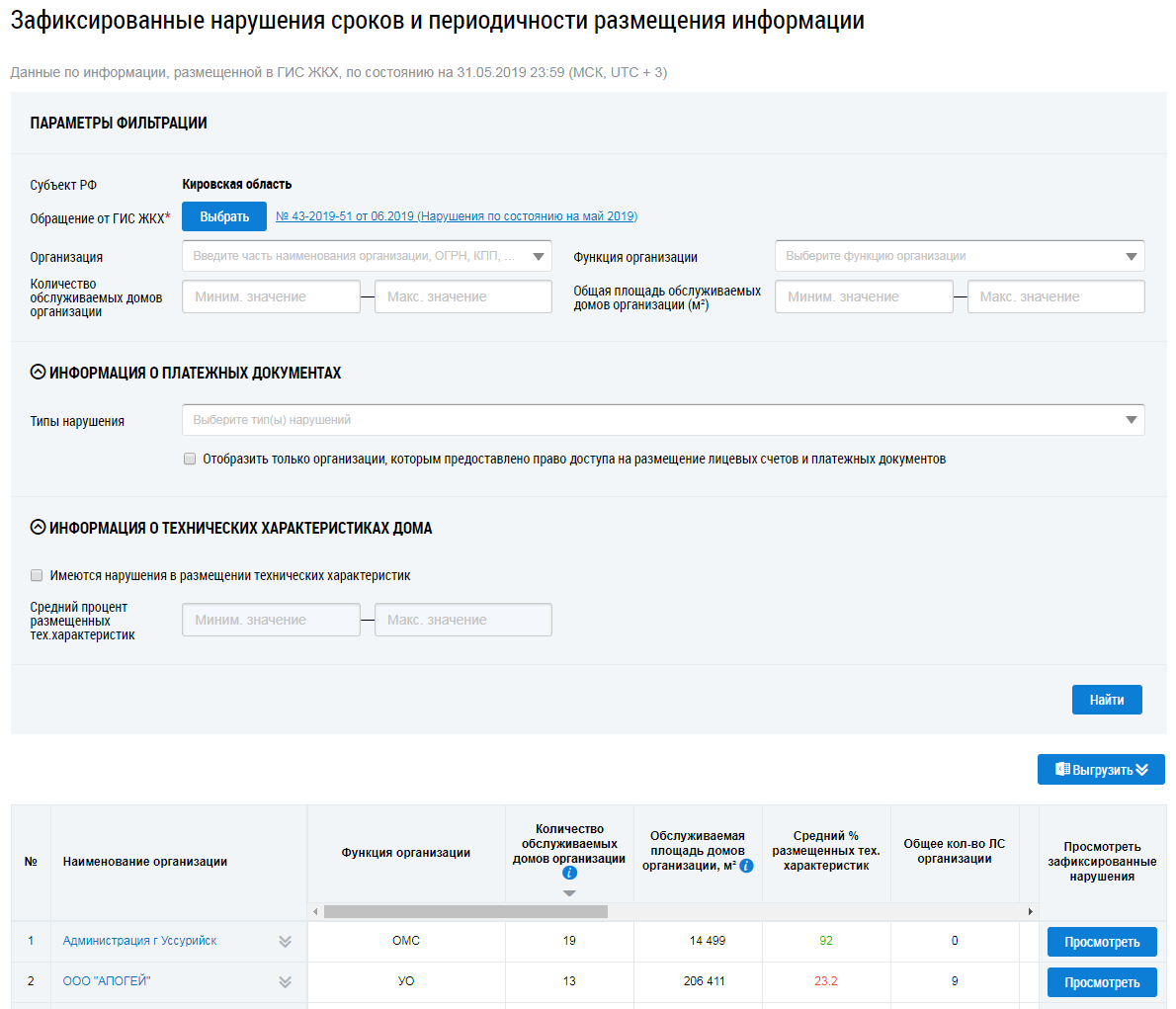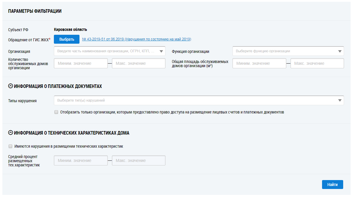 При наличии нарушений в размещении технических характеристик объектов жилищного фонда интересующими вас организациями установите флажок Имеются нарушения в размещении технических характеристик и укажите диапазон значений в поле Средний процент размещенных тех.характеристик.