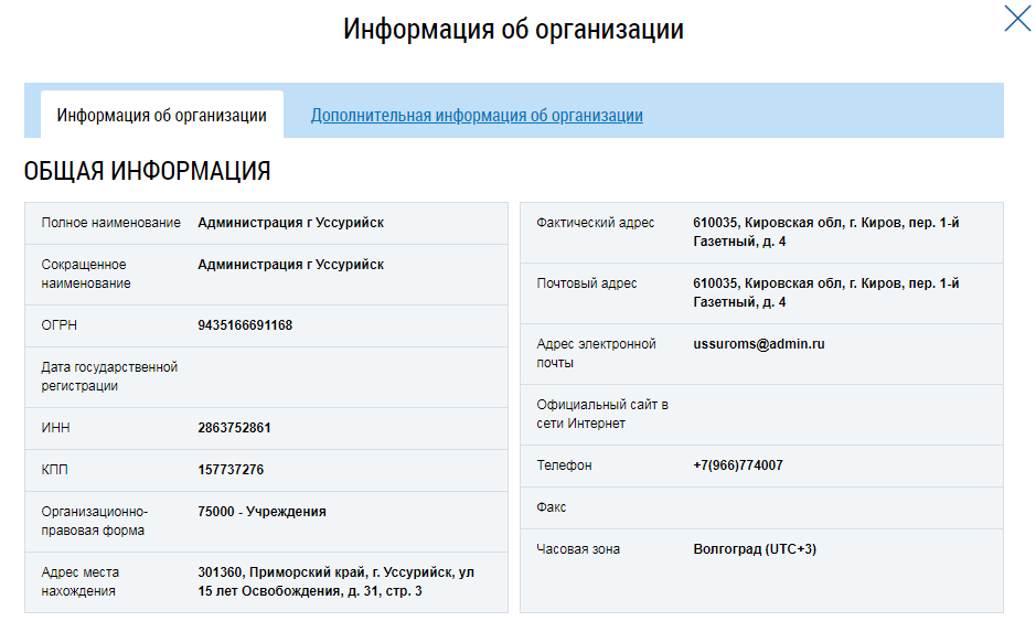 В верхней части страницы расположен блок с информацией об организации. Для просмотра информации об организации нажмите на гиперссылку с наименованием организации в данном блоке.