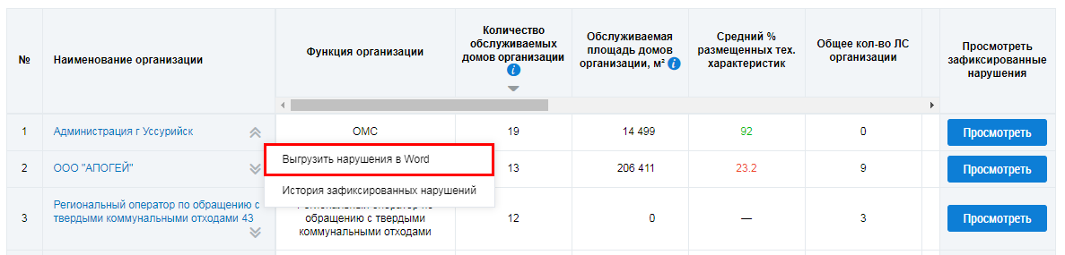 Для получения списка выявленных Системой нарушений, допущенных интересующей вас организацией, раскройте контекстное меню организации в блоке результатов поиска и выберите пункт Выгрузить нарушения в Word.