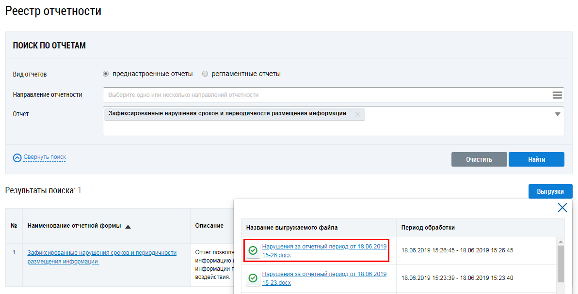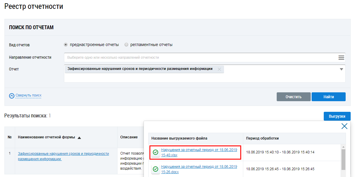 Для сохранения сформированного отчета нажмите на кнопку Выгрузки на странице Реестр отчетности и выберите в выпадающем списке необходимый отчет. Файл отчета хранится в Системе 10 дней.