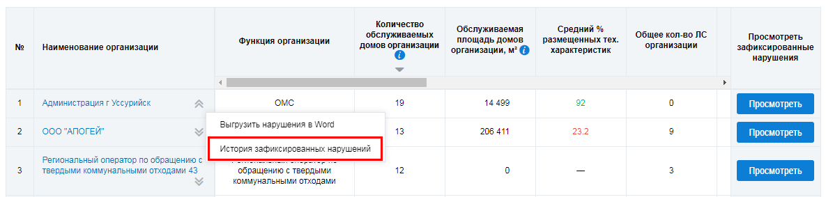 Для просмотра истории нарушений, допущенных организацией и зафиксированных Системой, раскройте контекстное меню организации в блоке результатов поиска и выберите пункт История зафиксированных нарушений.