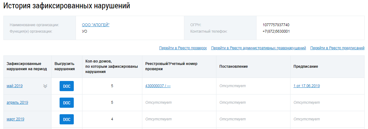 Ниже расположена таблица зафиксированных нарушений для данной организации за все предыдущие периоды. Каждая строка таблицы соответствует определенному периоду размещения информации. Для просмотра нарушений за интересующий вас период нажмите на гиперссылку с интересующим вас периодом в столбце Зафиксированные нарушения на период. В данный отчет не включаются нарушения в размещении платежных документов, в отношении которых размещена информация о принятых мерах. Для экспорта данной информации в формате Word нажмите на кнопку DOC в столбце Выгрузить нарушения напротив интересующего вас периода. В столбцах Реестровый/Учетный номер проверки, Постановление и Предписание находятся ссылки на проведенные проверки, выданные предписания и постановления. Нажмите на гиперссылку с интересующим вас постановлением, предписанием или проверкой для ознакомления.