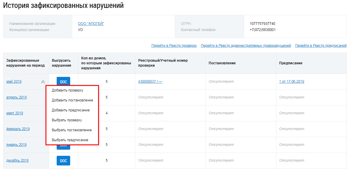 Существует возможность добавить в текущий период новое постановление, предписание или информацию о проверке (либо выбрать таковые из уже имеющихся в реестрах). Для этого раскройте контекстное меню текущего периода и выберите интересующий вас пункт.