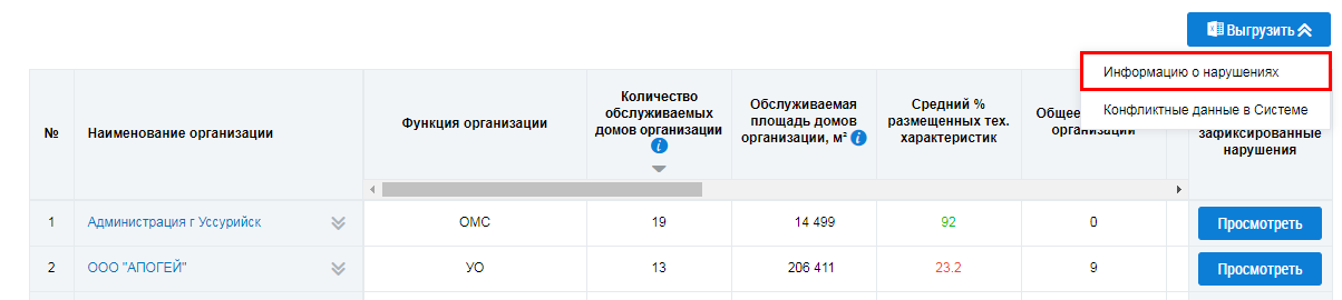Для выгрузки информации, отображаемой в блоке результатов поиска, в виде xlsx-файла нажмите на кнопку Выгрузить, расположенную под блоком Параметры фильтрации, и выберите пункт Информацию о нарушениях.