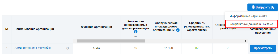 Существует возможность выгрузить информацию о конфликтных данных в Системе. Под конфликтными данными понимаются, например, случаи, когда в Системе находятся несколько организаций c пересекающимся периодом управления по дому и т.п. Для выгрузки конфликтных данных в виде xlsx-файла нажмите на кнопку Выгрузить, расположенную под блоком Параметры фильтрации, и выберите пункт Конфликтные данные в Системе.