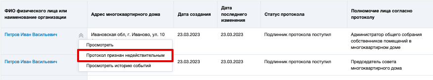 Система позволяет признать протокол недействительным в статусе протокола Подлинник протокола поступил. Для этого выберите пункт контекстного меню Протокол признан недействительным для протокола в статусе Подлинник протокола поступил.