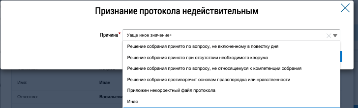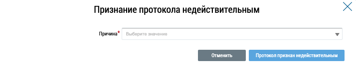В выпадающем списке в поле Причина выберите нужное значение и нажмите на кнопку Продолжить (Окно «Признание протокола недействительным».). Протокол переходит в статус Признан недействительным (при рассмотрении).