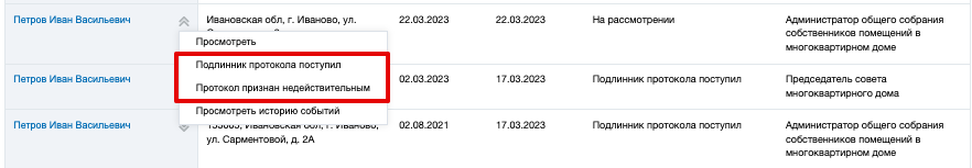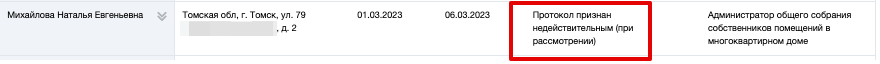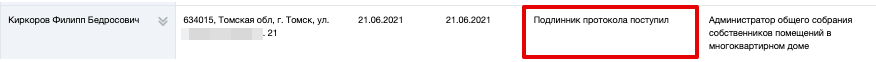 В случае если не выявлены нарушения, в протоколе нажмите на кнопку Подлинник поступил (Страница «Сведения об администраторе ОСС помещений в МКД». Кнопки «Протокол признан недействительным», «Подлинник протокола поступил»). Протокол переходит в статус Подлинник протокола поступил.