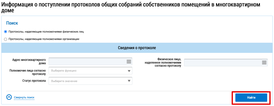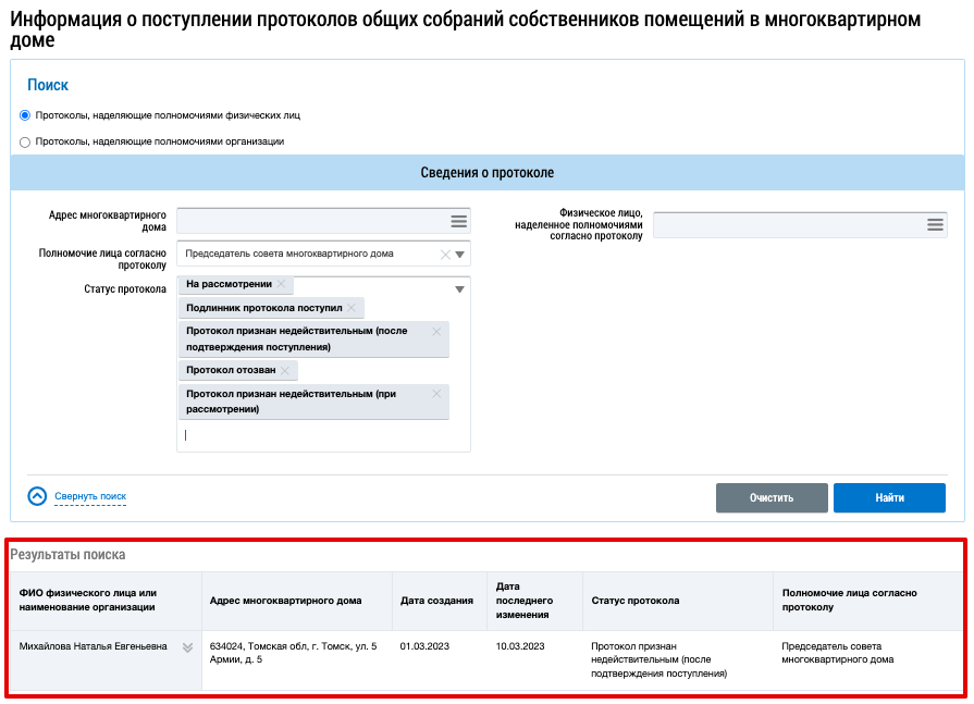 По умолчанию в результатах поиска отображается перечень функций физических лиц. Установите необходимые параметры поиска обращений и нажмите на кнопку Найти.