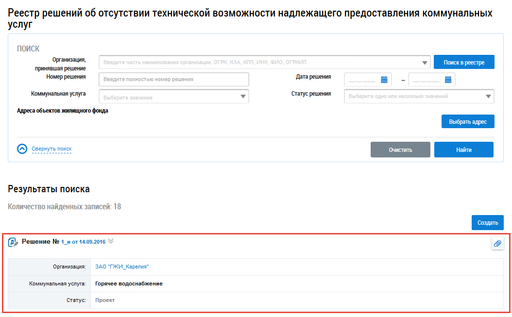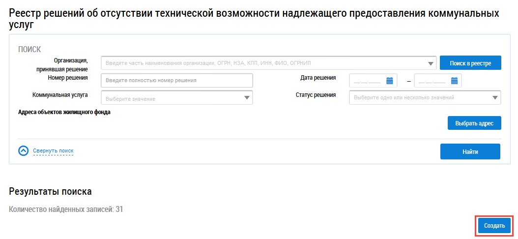 Для создания решения об отсутствии технической возможности надлежащего предоставления коммунальных услуг нажмите на кнопку Создать.