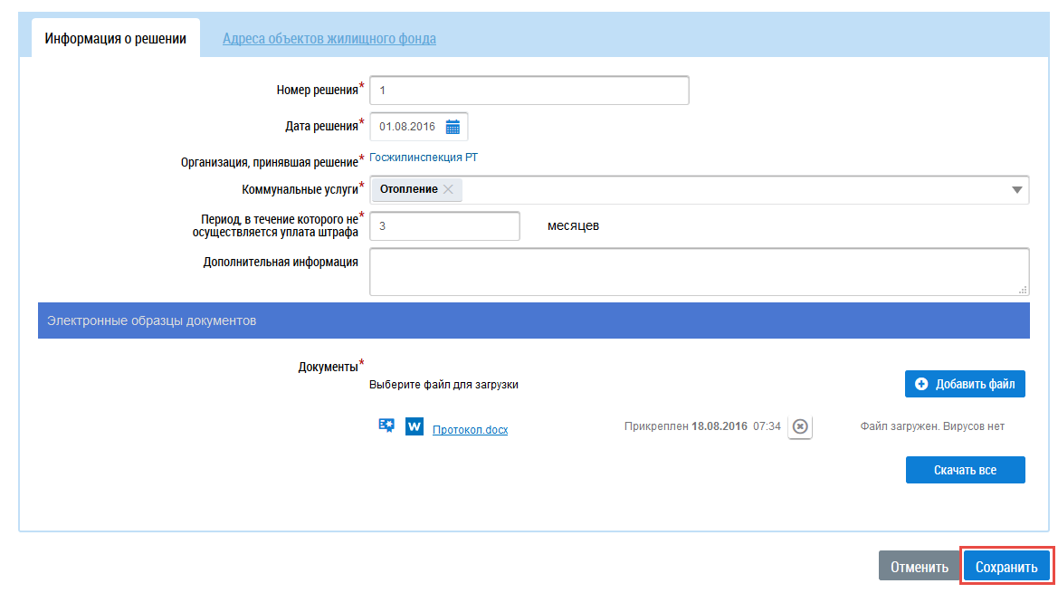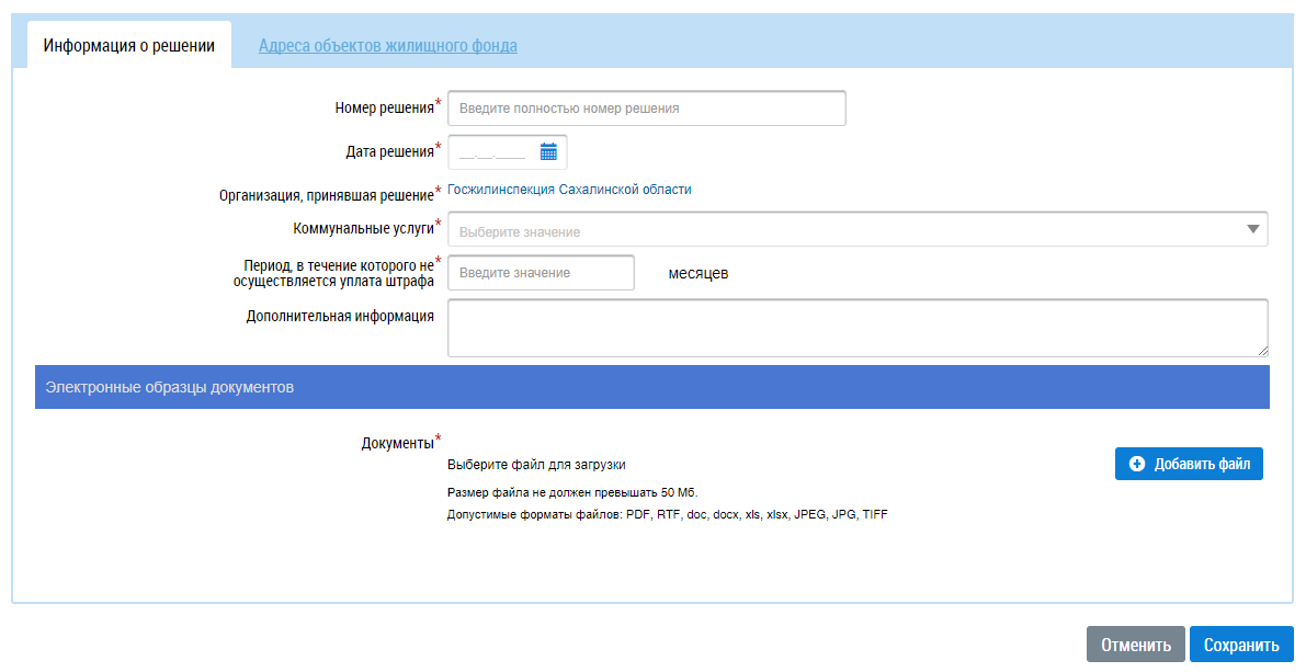 Последовательно заполните обязательные поля. Введите значения в поля Номер решения и Дата решения. Для заполнения поля Коммунальные услуги выберите значение из выпадающего списка. В поле Период, в течении которого не осуществляется уплата штрафа введите количество месяцев. Прикрепите документ в блоке Электронные образцы документов, нажав на кнопку Добавить файл.