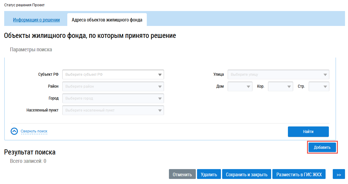 Для добавления объекта жилищного фонда нажмите на кнопку Добавить.