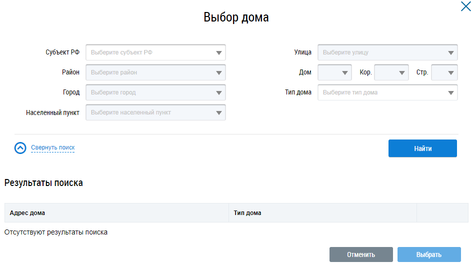 Установите необходимые значения поиска и нажмите на кнопку Найти. Установите флажок в поле необходимого адреса дома и нажмите на кнопку Выбрать.