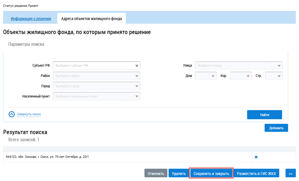 Для поиска объектов жилищного фонда, по которым принято решение, установите необходимые параметры, начиная с поля Субъект РФ и нажмите на кнопку Найти.