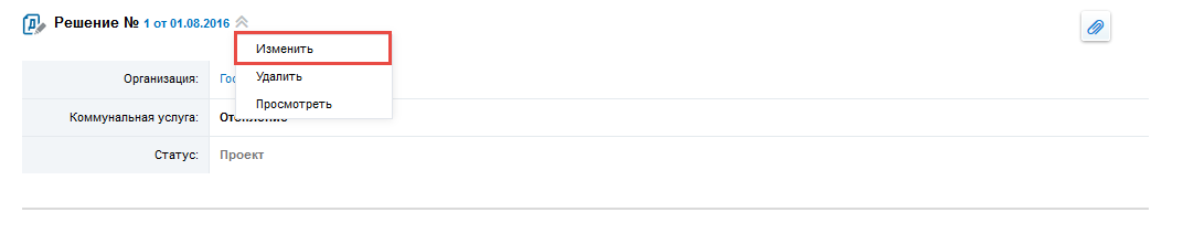 Для изменения решения выберите пункт контекстного меню Изменить решения в статусе Проект.